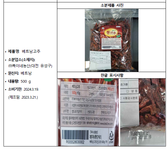 주식회사 거산무역(서울시 양천구)이 수입한 베트남산 고추 (생산연도:2022년)와 이 제품을 소분 판매한