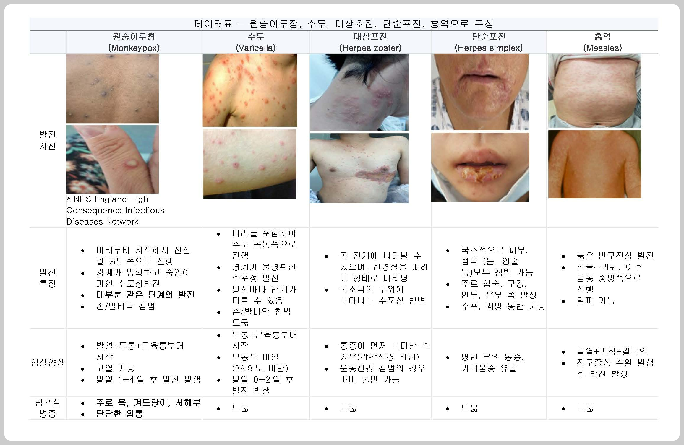 ♣엠폭스 (원숭이두창)과 다른 피부질환하고 헷갈릴 수 있는데요, 아래의 표를 보고 확인해 보세요