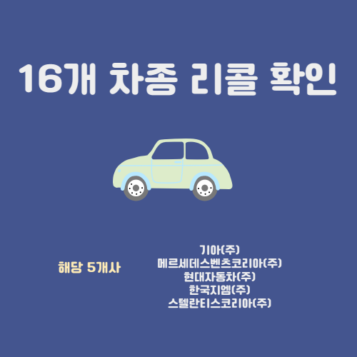 국토교통부에서 5개사의 16개 차종의 리콜을 발표했습니다. 기아(주), 메르세데스벤츠코리아(주), 현대자동차(주), 한국지엠(주), 스텔란티스코리아(주)에서 제작 또는 수입.판매한 차종인데요 해당 사의 차를 구매하신 분들은 어떤 차종인지 확인해 보시고 해당되시면 무상 수리 받으세요