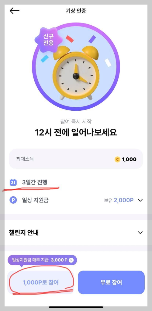 그럼 어떻게 신청하는지 알아보겠습니다. 12시 전 일어나고 1,000C 받기를 신청을 누릅니다. 이 챌린지를 신청하기 위해서는 1,000P가 필요하다는 게 나오고, 3일간 진행해야 성공하게 됩니다